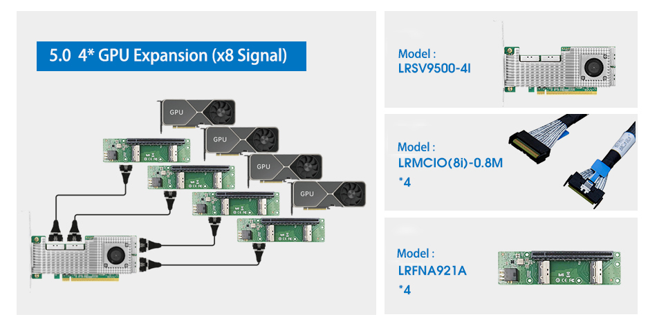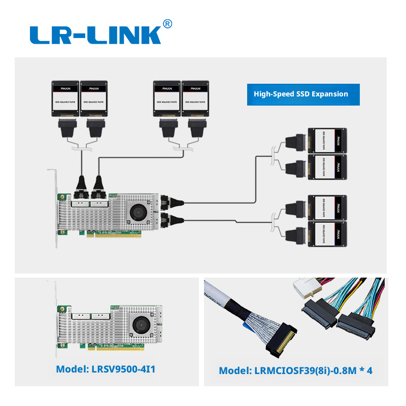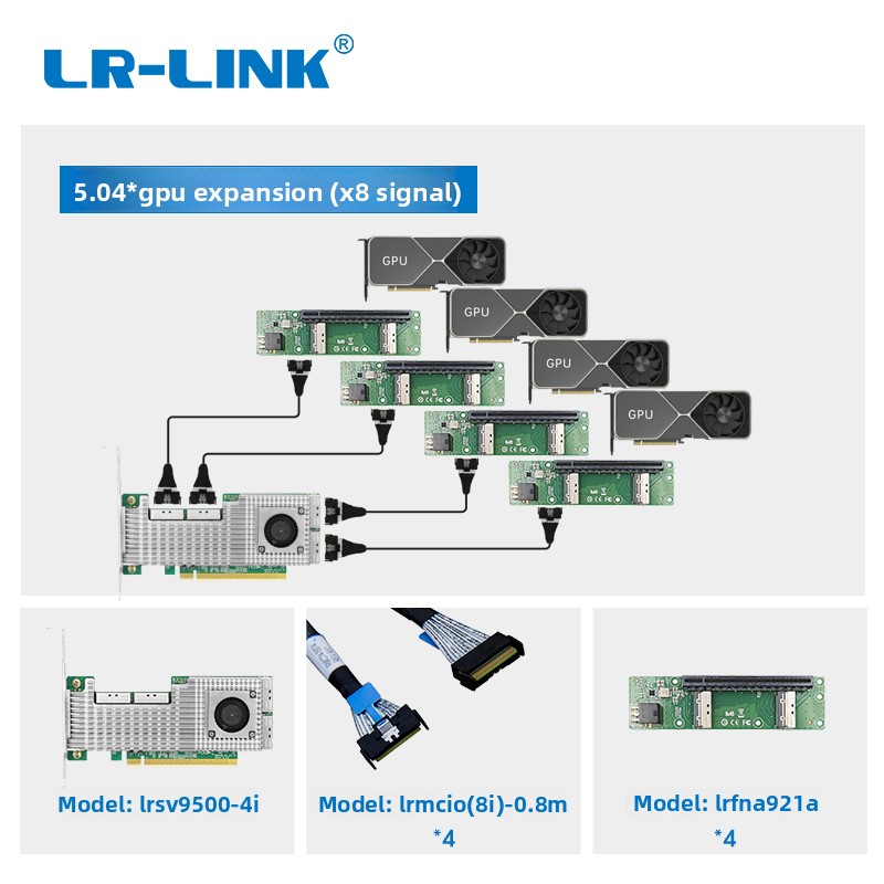 LRSV9500-4I is a PCIe5.0 x16 to 4-port built-in MCIO8I NVMe switch adapter developed by Linkreal Co., Ltd.based on Broadcom PEX89048. It supports two X16, four X8, eight X4 three flexible splitting methods, users can be flexibly configured according to the actual needs, whether it is high-bandwidth single-device access or multi-device parallel processing, can be easily dealt with. It can directly support up to 8 M.2, U.2/U.3 or E3.S SSDs. Designed for high-end application scenarios such as SSD performance testing, GPU expansion testing, etc., the LRSV9500-4I accelerates the product development and validation process by ensuring the accuracy and real-time availability of test data through high-bandwidth, low-latency PCIe 5.0 connections.