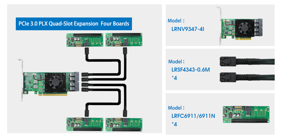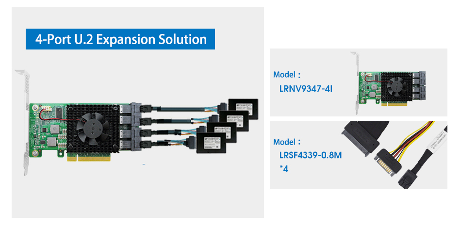 LRNV9347-4I NVMe Adapter is PCI Express x16 Gen3 PCIe switch Card. It allows us to connect 4x U.2 device at full speed to a host system, and it expands the maximum storage of the 4 U.2 SSD via scalable, high-bandwidth, non-blocking interconnection to a wide variety of graphics applications including servers, storage, communications, and graphics platforms. It is optimized to support high-resolution graphics while supporting peer-to-peer traffic and multicast for maximum performance.