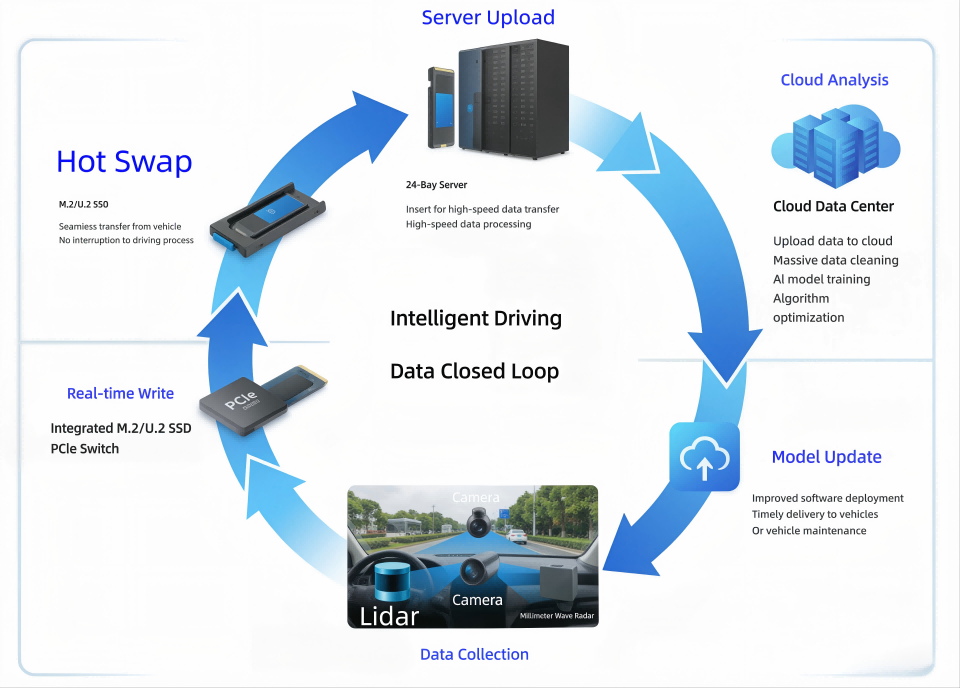 With the rapid iteration of intelligent driving technologies, the collection and storage of road-test data have become a critical bottleneck hindering industry development. This paper provides an in-depth analysis of storage solutions based on PCIe switch hard-drive expansion cards, U.2 expansion cards, and M.2 expansion cards. It focuses on how SSD hot-swapping technology enables seamless disk replacement without interrupting operations, thereby helping providers of end-to-end autonomous driving solutions build efficient data infrastructure.