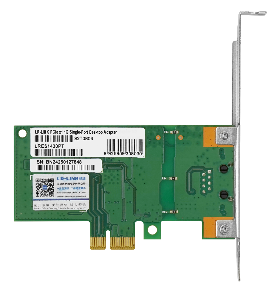LRES1430PT is a desktop Gigabit Ethernet network adapter independently developed by Linkreal Co., Ltd., based on the MUCSE N210L domestic controller solution, and featuring a PCI Express x1 host interface. The adapter adopts a fully domestic design, with key components independently controllable, helping to reduce supply chain risks and enhance compatibility with localization (Xinchuang) and industry-specific markets.