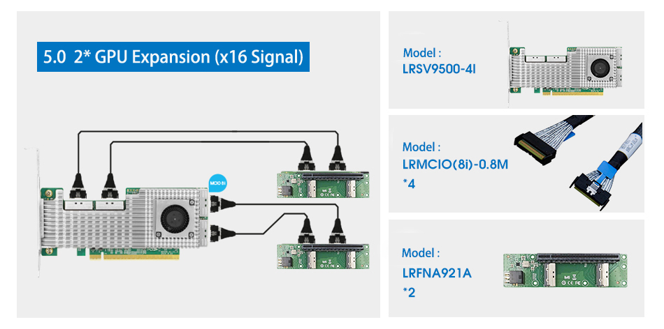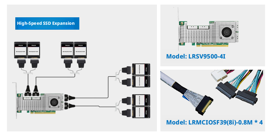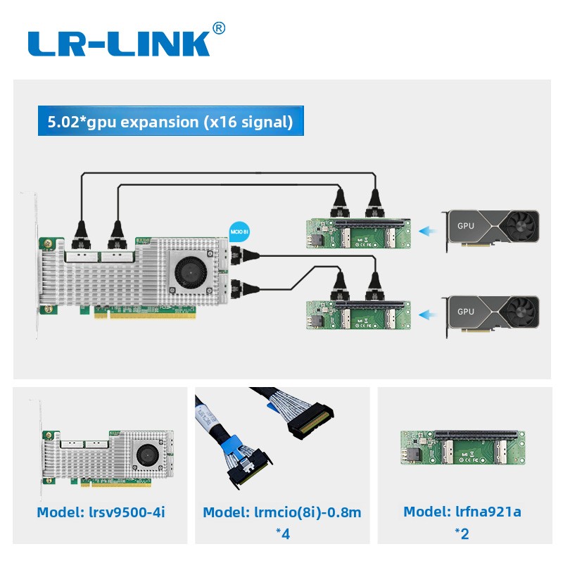 LRSV9500-4I is a PCIe5.0 x16 to 4-port built-in MCIO8I NVMe switch adapter developed by Linkreal Co., Ltd.based on Broadcom PEX89048. It supports two X16, four X8, eight X4 three flexible splitting methods, users can be flexibly configured according to the actual needs, whether it is high-bandwidth single-device access or multi-device parallel processing, can be easily dealt with. It can directly support up to 8 M.2, U.2/U.3 or E3.S SSDs. Designed for high-end application scenarios such as SSD performance testing, GPU expansion testing, etc., the LRSV9500-4I accelerates the product development and validation process by ensuring the accuracy and real-time availability of test data through high-bandwidth, low-latency PCIe 5.0 connections.