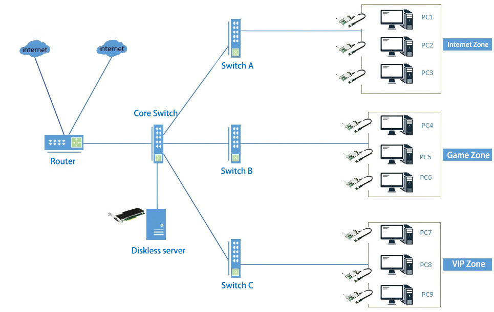 In internet café applications, the PXE feature enables client machines (such as PC4, PC5, PC6, etc.) to boot, run, and load resources over the network without requiring local hard drives, utilizing devices like diskless servers.