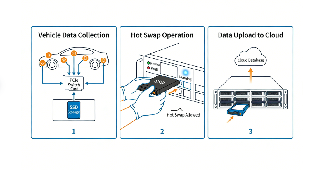 With the rapid iteration of intelligent driving technologies, the collection and storage of road-test data have become a critical bottleneck hindering industry development. This paper provides an in-depth analysis of storage solutions based on PCIe switch hard-drive expansion cards, U.2 expansion cards, and M.2 expansion cards. It focuses on how SSD hot-swapping technology enables seamless disk replacement without interrupting operations, thereby helping providers of end-to-end autonomous driving solutions build efficient data infrastructure.