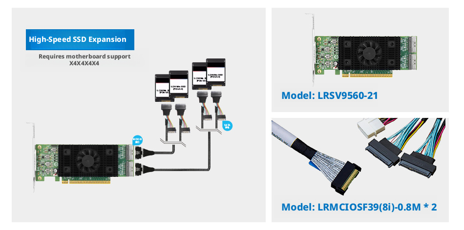 LRSV9560-2I is a PCIe5.0 x16 to Internal 2*MCIO 8i Retimer NVMe Expansion Card developed by Linkreal Co., Ltd. based on Montage M88RT51632 host controller solution, which adopts the PCIe 5.0 x16 standard and provides a data transfer rate of up to 32 GT/s, ensuring efficient data flow in servers, data storage systems and high-performance workstations. efficient data flow through servers, data storage systems and high-performance workstations. Two MCIO 8i Retimer NVMe slots are built-in for a variety of expansion scenarios, including SSD direct-attachment expansion, capacity expansion via expansion backplanes, and support for GPU expansion to meet large-scale data storage and high-speed access requirements. The card supports CXL 2.0 Alt mode, enabling users to share memory for higher performance and more flexible system configurations to meet the needs of different workloads.The versatile design of the LRSV9560-2I makes it an ideal choice to meet the high performance, reliability, and scalability needs of enterprises, providing an excellent solution for data processing and storage requirements.