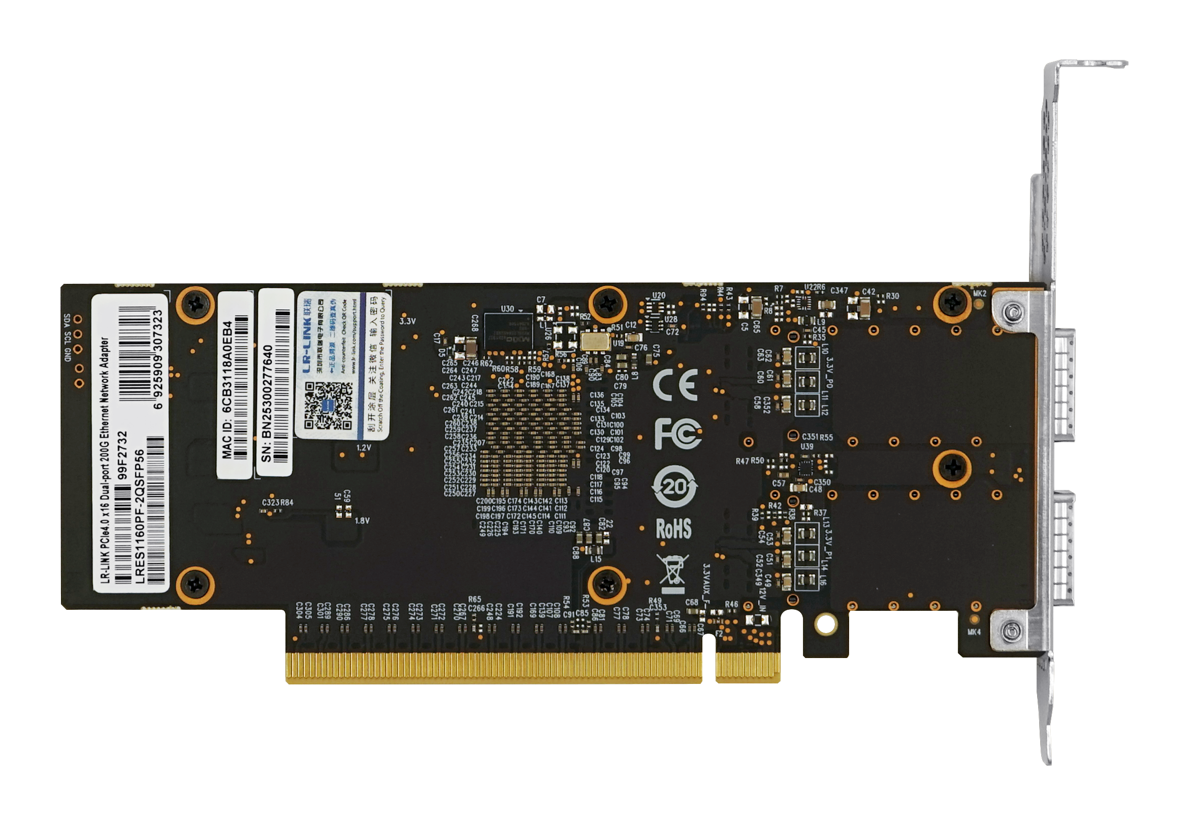 LRES1160PF-2QSFP56 is a PCIex16 dual-port 200G QSFP56 Ethernet network adapter. Its master control technology and high-bandwidth PCIex16 interface ensure excellent data processing speed under high-load environments, providing users with reliable and efficient network connections. The network card supports data transmission rates up to 200G, providing excellent bandwidth performance for modern high-demand network applications; supports RDMA (RoCEv2), which greatly reduces the CPU load and improves the overall performance and throughput of the system; supports GPU Direct, so that data can interact directly with the GPU without CPU participation, and has an unparalleled performance experience in high-load GPU scenarios such as AI/ ML; In addition, LRES1160PF-2QSFP56 also supports virtualized network protocols such as VXLAN, Geneve, and NVGRE, enabling it to better handle network traffic and achieve flexible network isolation and management when building virtualized environments and cloud computing platforms.